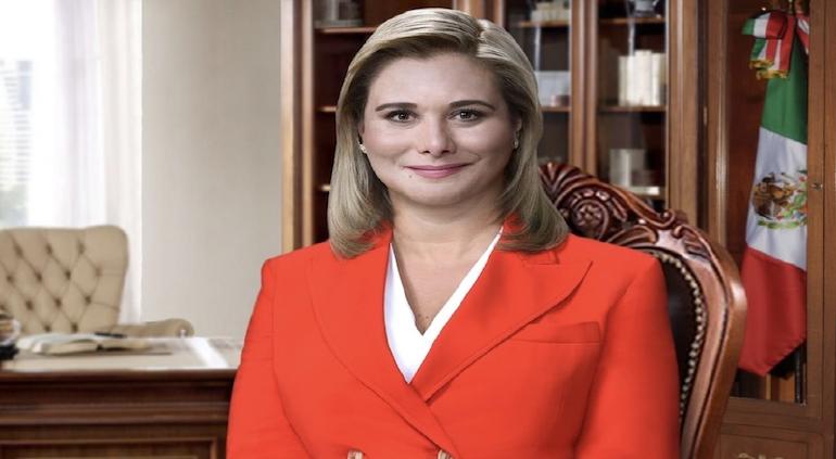 Con un traje sastre color naranja, Maru posa en una silla con las manos al frente, en segundo plano se observa un escritorio con una pluma y un libro. Al fondo un librero y la bandera de México.